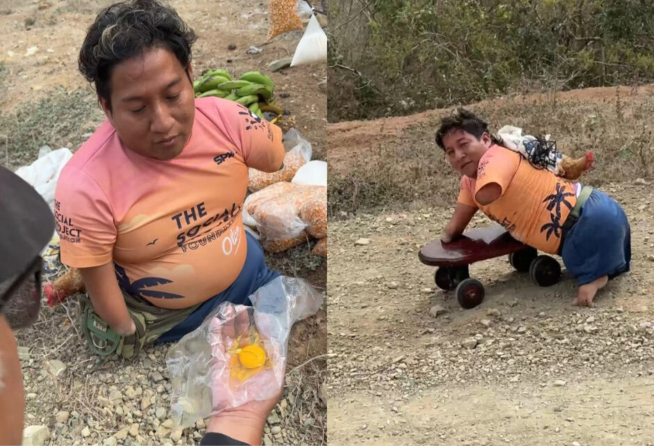 He loads his cart with everything he can carry - eggs, chickens, grains, milk - and pushes himself forward on a makeshift skateboard, using his remaining arm and core strength to move. The physical toll is immense: infections from ground contact, chronic pain, exhaustion. But Jonatan has a dream: to walk again, to provide better for his mother, to live with dignity.